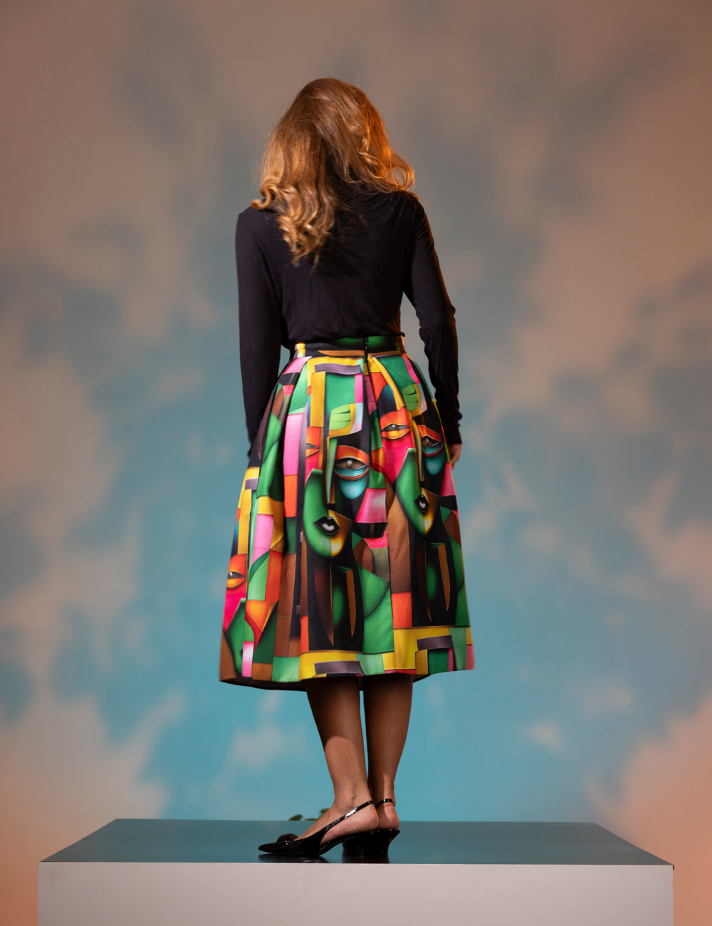 - Fustă midi cu cute, din material imprimat cu forme viu colorate.